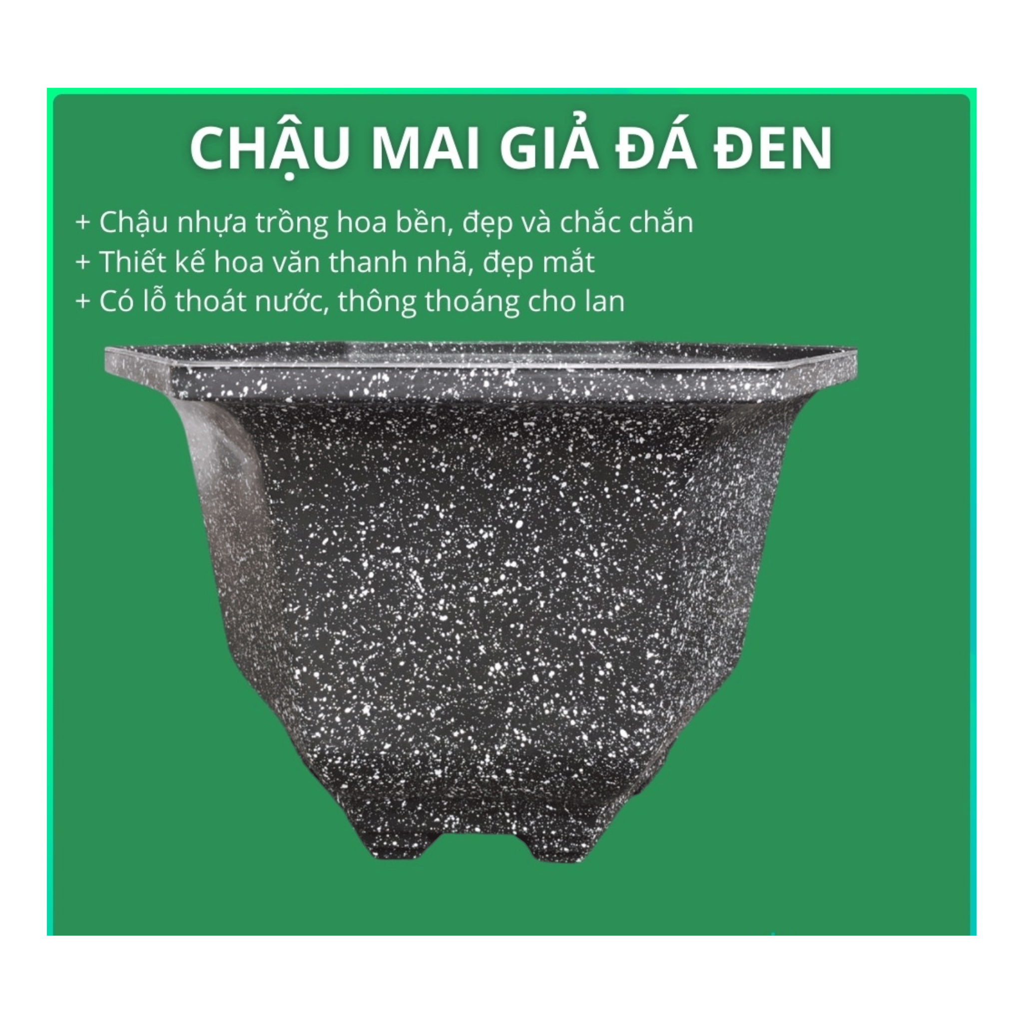 Chậu Mai Đen Giả Đá trồng rất thích hợp trồng những dòng hoa lan, rau sạch, rau mùi, cây hoa kiểng: hoa Mười Giờ, hoa Hồng, hoa Giấy, hoa Sử Quân Tử, hoa Dạ Yến Thảo, Cẩm Nhung, Cúc, Dâu, cây Hoa Sam, cây Lan Hạt Dưa… hoặc các loại cây để bàn.