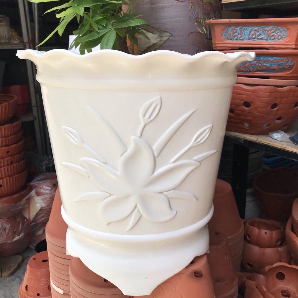 - Màu sắc chậu trắng sáng sang trọng, dễ lau chùi, vệ sinh và thay đất; vành miệng chậu tai bèo. Bề mặt in họa tiết in hoa nổi với công nghệ ép nhựa đến từ Nhật Bản.
