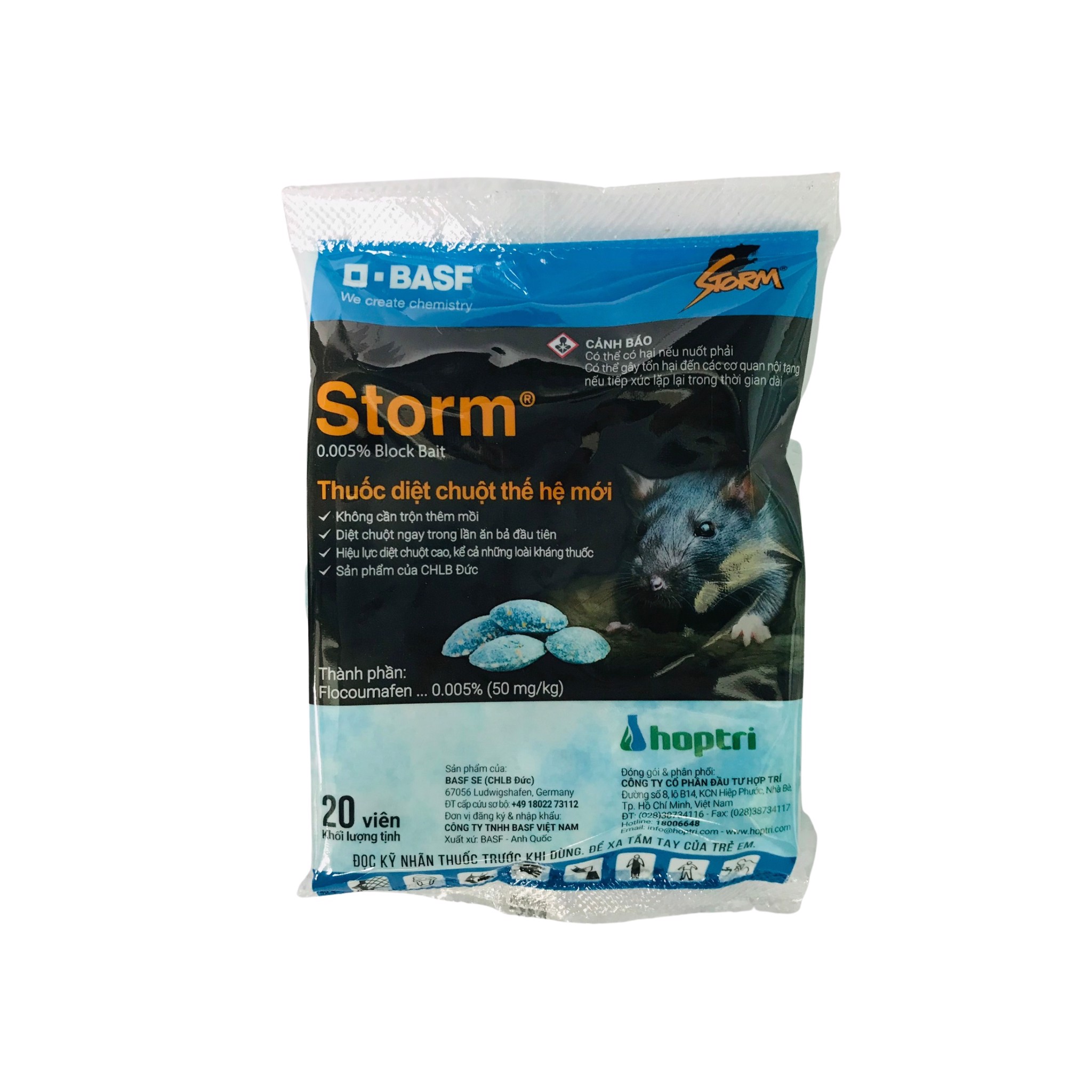 CƠ CHẾ TÁC ĐỘNG: Thuốc diệt chuột Storm chứa hoạt chất Flocoumafen tấn công ngay vào gan gây ức chế việc sản sinh vitamin K1 làm cản trở sự hình thành các yếu tố đông máu.Sau khi ngấm thuốc, chuột sẽ lờ đờ, mệt mỏi, thải ra phân xanh, quay về hang trú ẩn, và không tiếp tục cắn phá thêm.Chuột chết sau 3-5 ngày sau khi ăn phải thuốc (nội tạng bị xuất huyết)Tác động thuốc gây chết chậm nên chuột sẽ không nghi ngờ, không nhát mồi. Chuột mẹ ăn phải thuốc, Flocoumafen sẽ theo sữa diệt luôn cả chuột con đang bú.