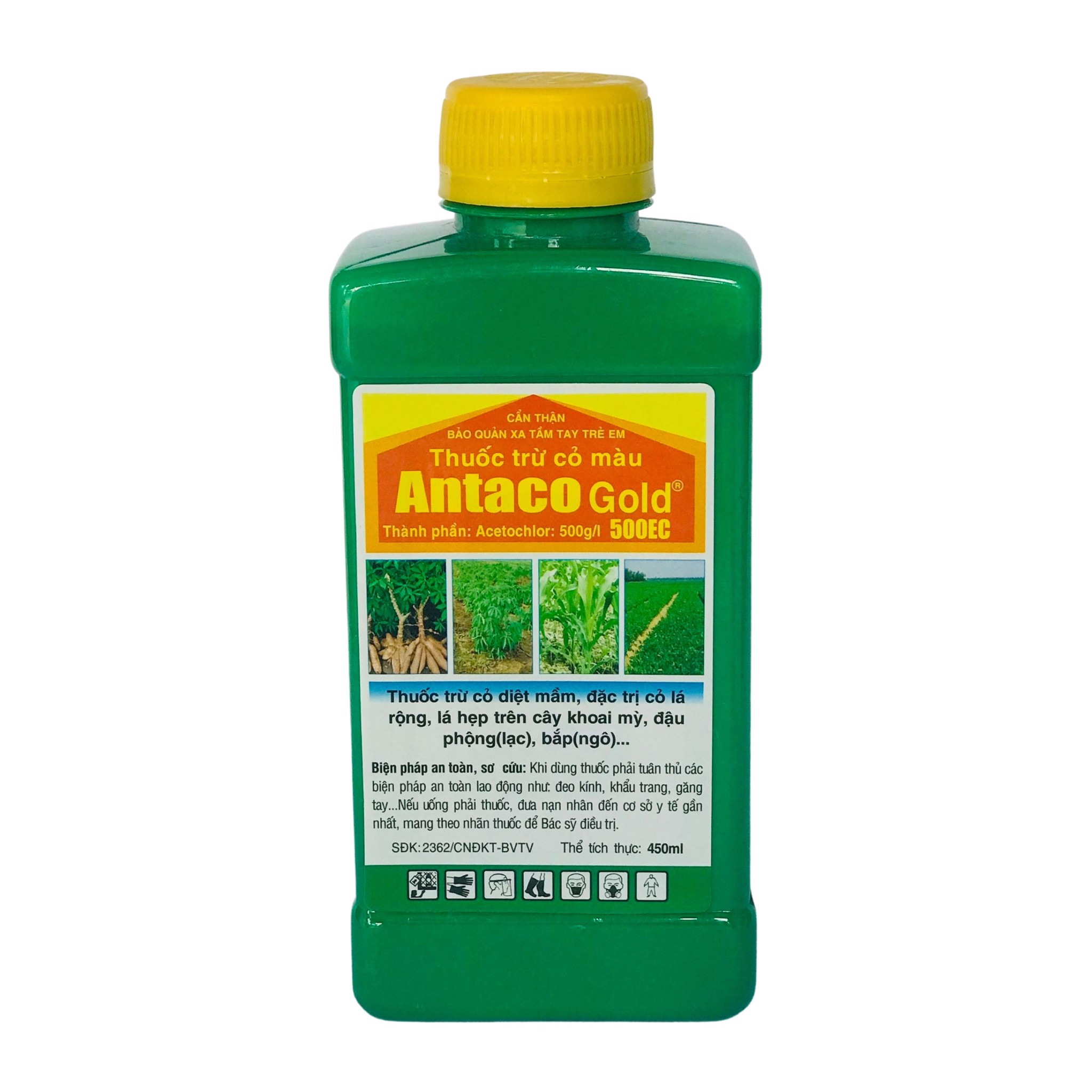 - Antaco gold 500EC là thuốc trừ cỏ diệt mầm, nội hấp lưu dẫn, dùng để diệt mầm cỏ, trừ được hầu hết các loại cỏ lá rộng, lá hẹp như Cỏ hoà bản, lồng vực, chỉ, túc, đuôi chồn, mần trầu, cỏ lác, cỏ gấu, cỏ lá rộng: Dền gai, cỏ rây, mắc cỡ trên khoai mỳ(sắn), bắp (ngô), lạc …